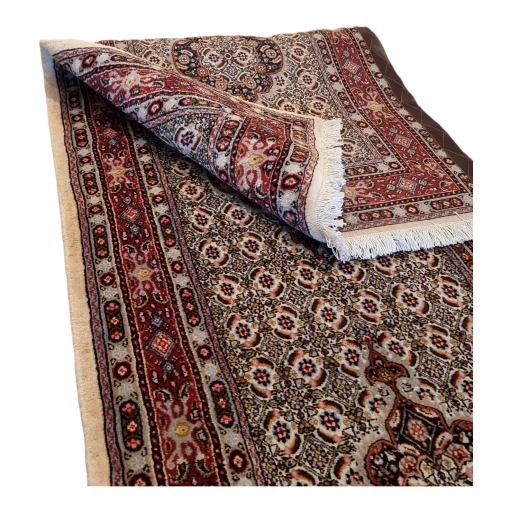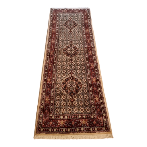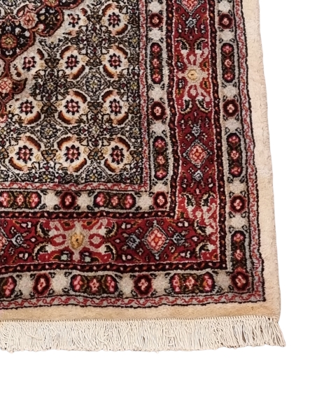 GRUNNFARGEN VED MOUD TEPPENE ER SOM OFTEST ELFENBENSHVIT ELLER BLÅTONET, MED RØDE ELLER BLÅ MOTIVER.